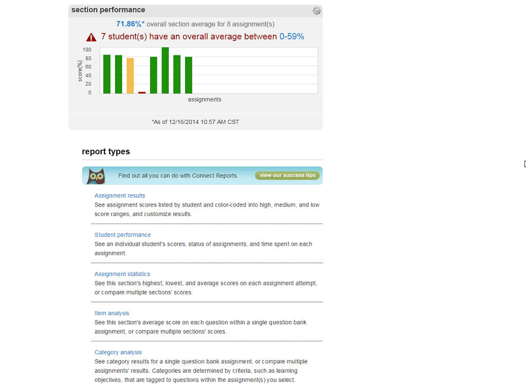 Save time and gain student insights. Connect provides customizable reports on student performance, learning outcomes, at-risk students, and integrates easily with LMS gradebooks.