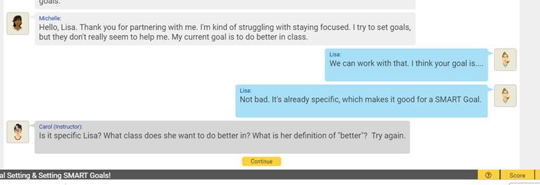 Bridge the gap between concept and application with 19 role-play Application-Based Activities that engage students and put them in a peer-to-peer consultative role. Students practice their critical thinking and problem solving skills as they help "a friend" work through a particular real-life challenge such as setting SMART goals, or building an effective resume. Each simulation is designed as a 10-15 minute experience, and includes motivational coaching from the virtual instructor as needed.