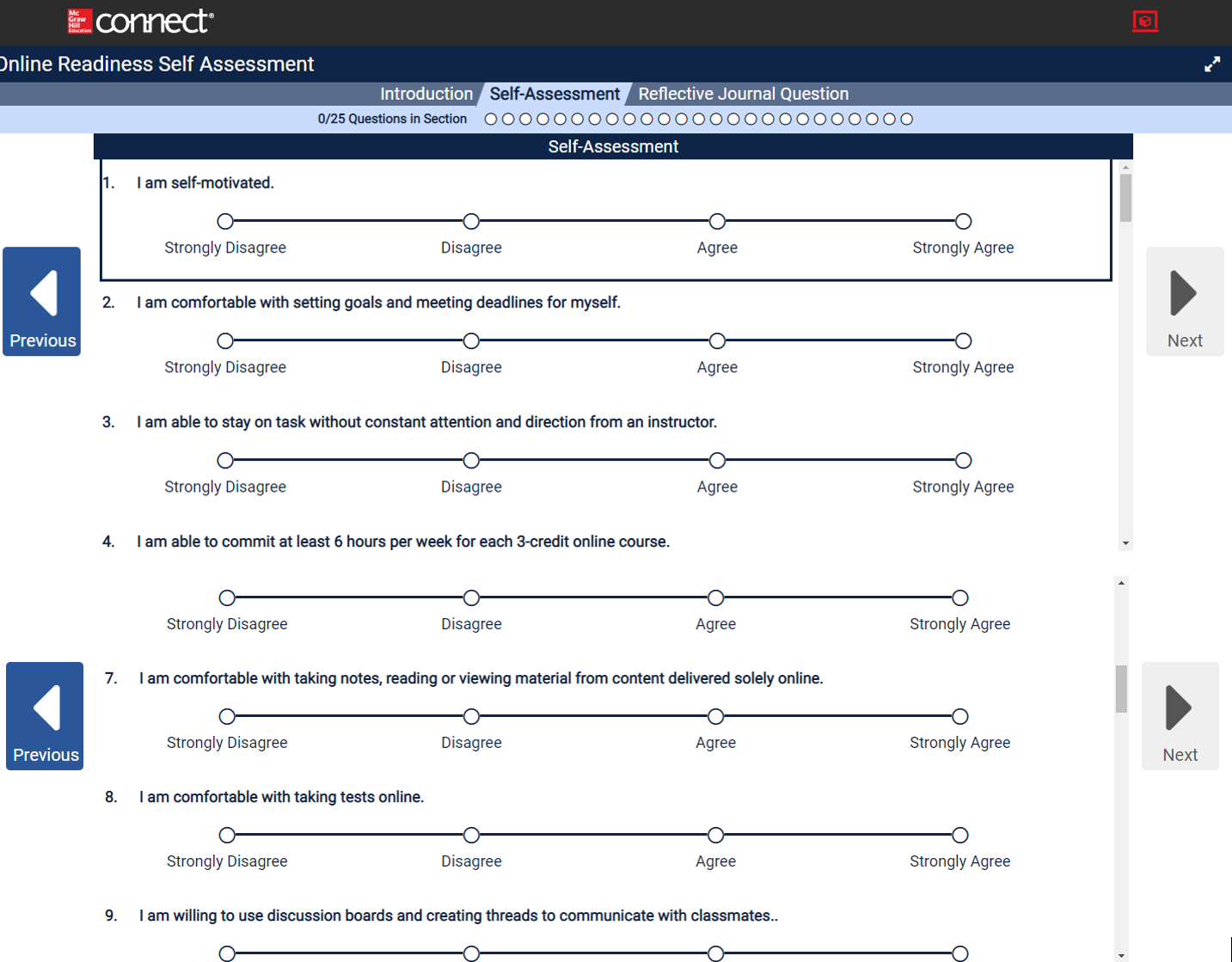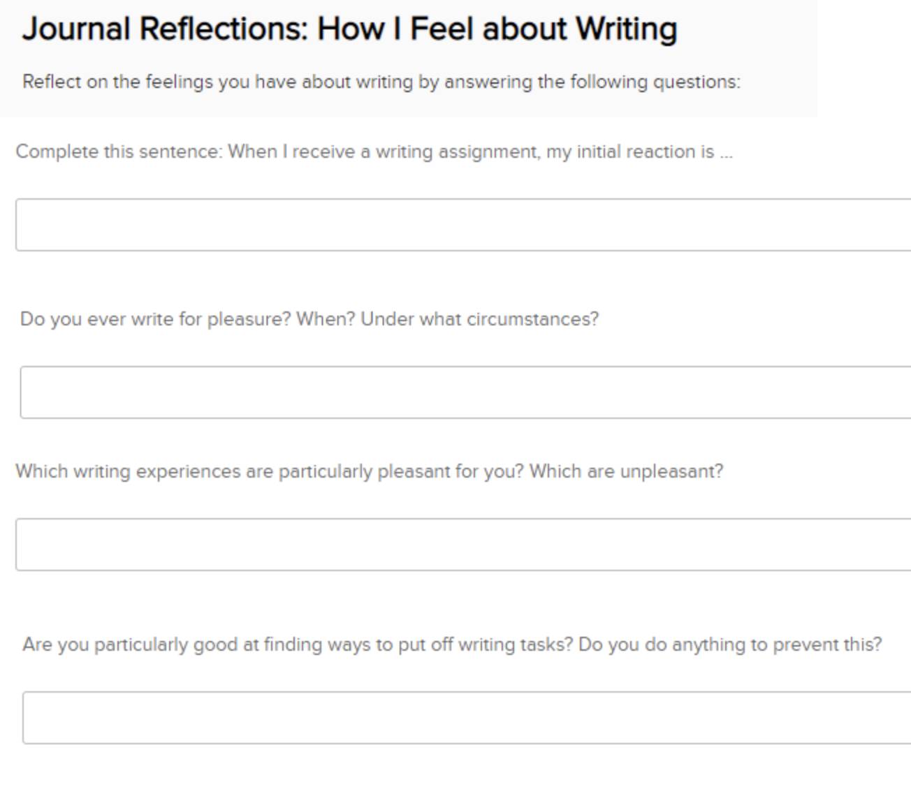 These exercises encourage students to do self-reflection and consider their personal habits as they pertain to life and college. These are essay style and require manual grading.