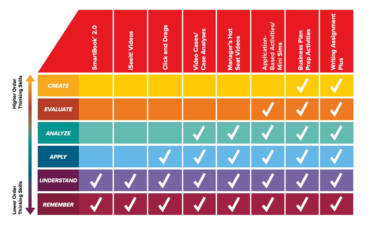 The chart below shows a few of the key assignable, digital assets available for Connect Student Success aligned with Bloom’s Taxonomy. Take your students higher by assigning a variety of application exercises, moving them from simple memorization to concept application.